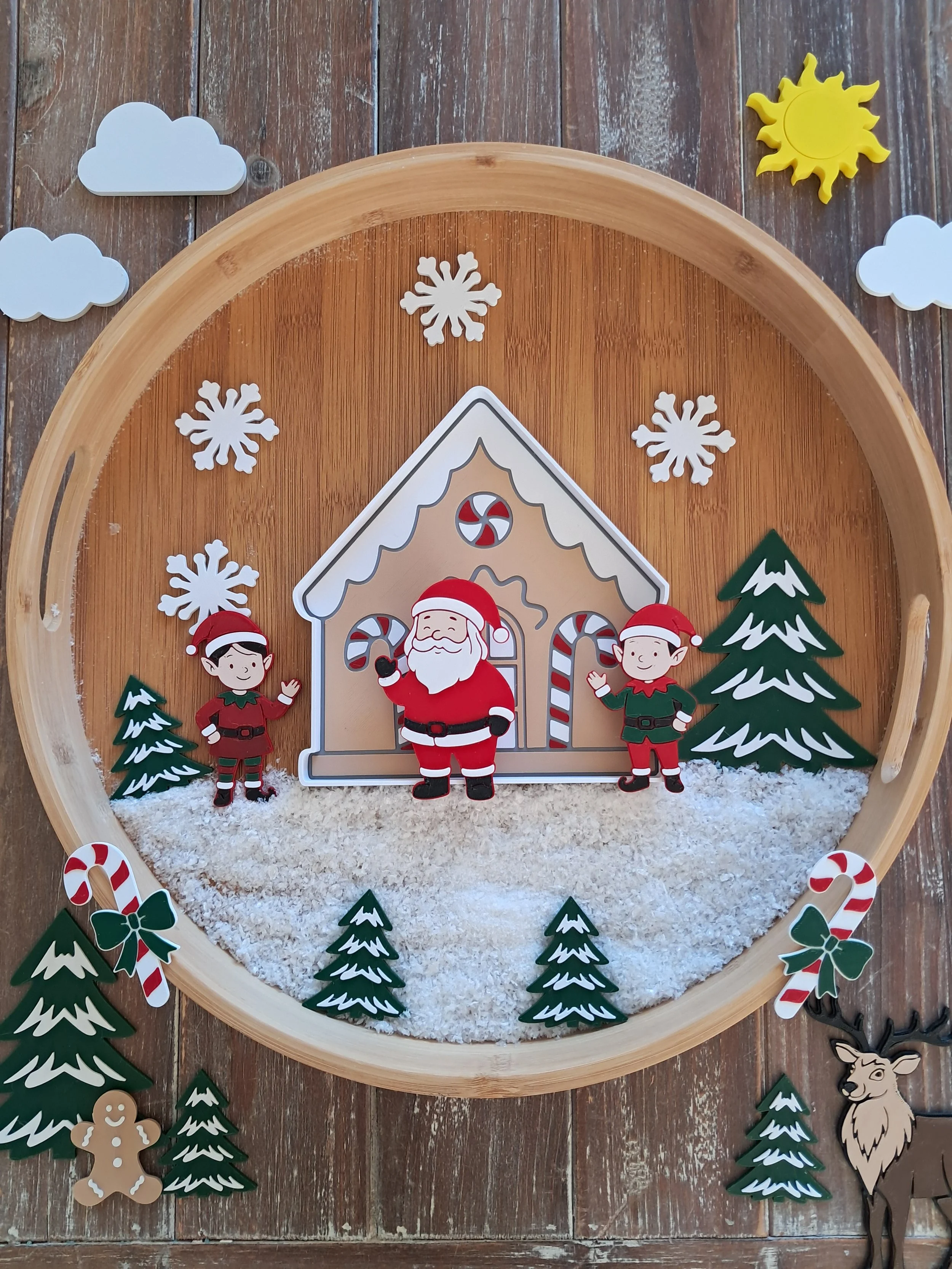 Avec ses sucre d’orge rouges et blancs, son toit enneigé et ses détails gourmands, elle transforme chaque bac sensoriel en un véritable pays des douceurs de Noël. Les enfants peuvent y verser du riz coloré, de la farine, des perles, ou même de la “neige magique” pour animer la scène et inventer mille histoires délicieuses.